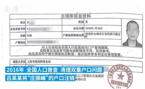 2016年的全国人口普查,清理双重户口问题,吕某某将"庄振峰"的户口注销,在家人面前,他又变回了吕某某。