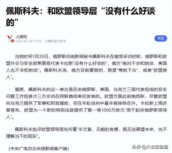2026年1月25日,佩斯科夫在接受采访时,没有丝毫外交辞令的委婉,直接表明俄罗斯不会和欧盟外交与安全政策高级代表卡拉斯进行任何形式的对话。
