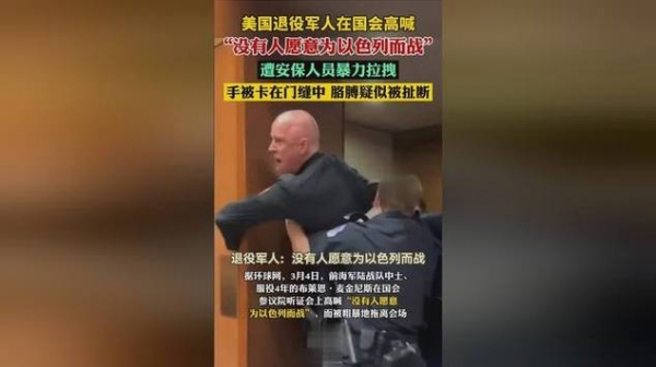 美国退役军人在国会高喊"没有人愿意为以色列而战"遭安保人员暴力拉拽,胳膊疑被扯断。当地时间3月4日,前海军陆战队中士布莱恩·麦金尼斯在国会参议院听证会上高喊"这是错的,没有人愿意为以色列而战",随后他被安保人员粗暴地拖离会场。