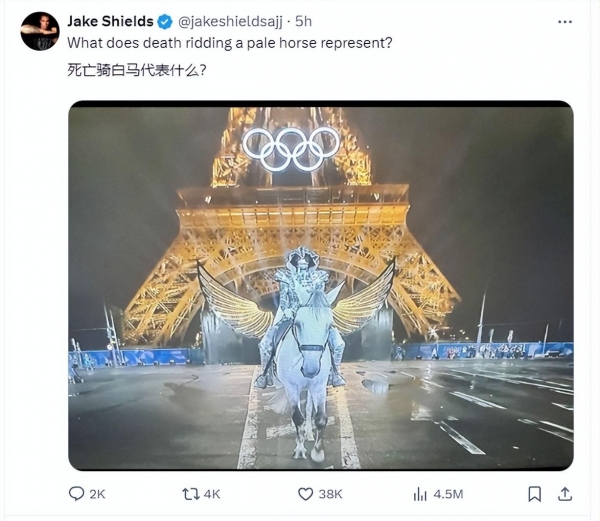 最受伤的还是基督徒,本来嘛,人家就不喜欢lgbt群体,但是现实生活中你选择过什么样的生活,人家也不干涉对不对,结果呢,巴黎奥运开幕式整了个这个,而这严重违背基督教教义。还有白马骑士,这简直是天启四骑士中的,象征瘟疫的白马骑士,基督徒纷纷破防,认为法国是不是故意的,是不是不欢迎基督徒。