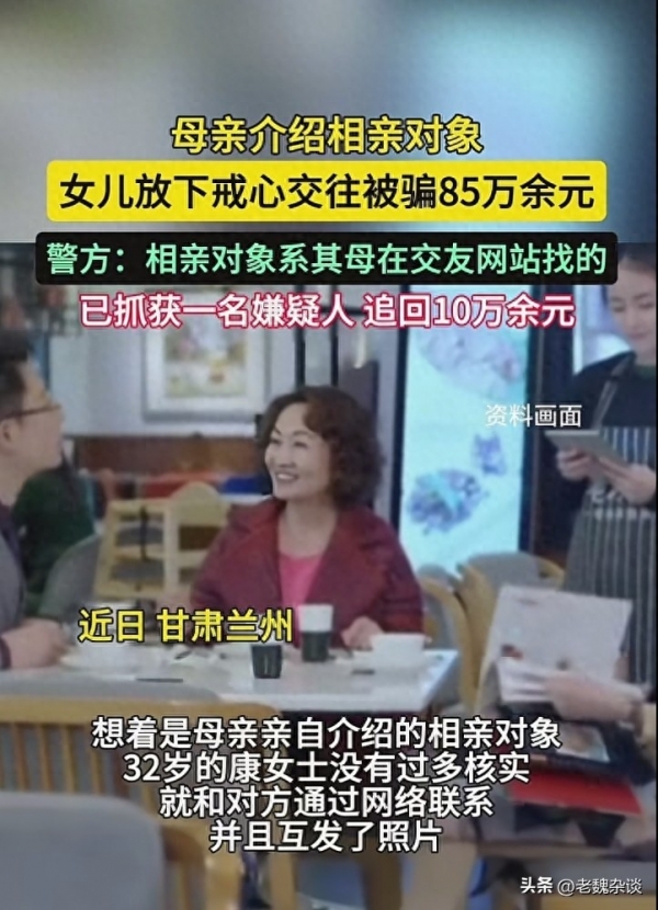 跟大家说个事,这真是一个让人又气又心疼的真实案例。一位兰州的康女士,因为母亲操心她的婚事,给她介绍了个相亲对象,结果没想到母亲的一片好心却让自己的女儿一步步掉进了骗子精心设计的陷阱,前后被骗走了85万多!最后连对方人影都没见着。你说说,这骗子得多可恨。