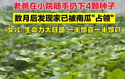 她拍下视频询问,这才得知,原来是清明节的时候,她老爸回家,在窗台上有4个南瓜子,就随手扔的,不是刻意扔的,也没往心里去。这次回去一打开门的瞬间,着实吓到了。算惊喜也算惊吓,不过很值得庆幸的是,没想到能够收获到果实。这个南瓜生命力的旺盛真的是太强大了。