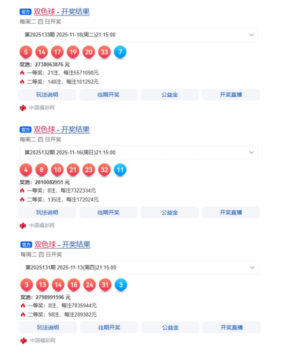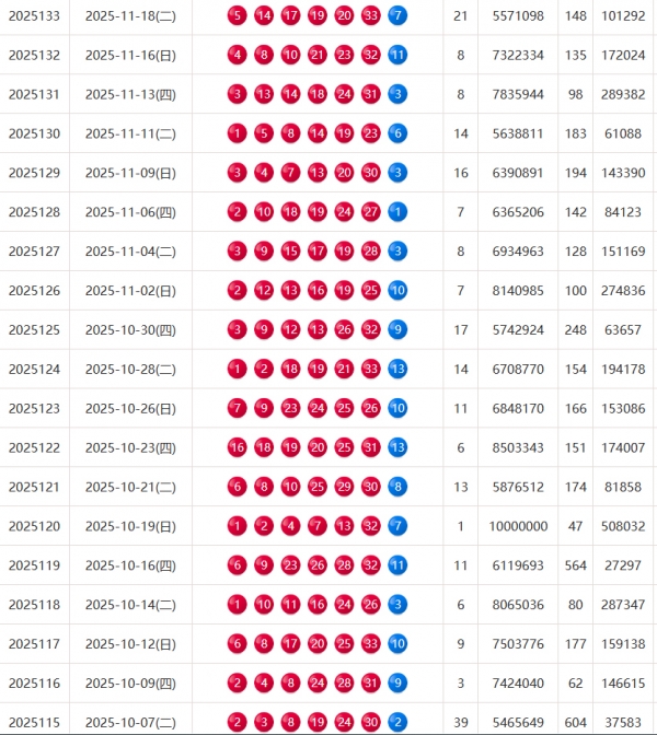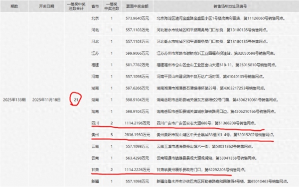 下面是双色球第2025133期一等奖中奖出处明细,点击看大图