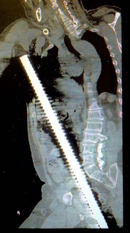 CT 2D、3D重建显示钢筋穿透盆腔、腹腔、胸腔