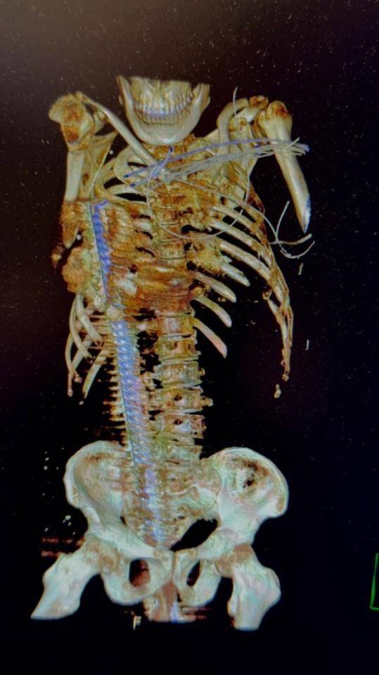 急诊医生接诊后,只见患者臀部附近露出一根长约15厘米,直径约3公分的钢筋。当即启动创伤应急机制,迅速开通静脉通路、实施心电监护、快速补液稳定血压,伤者被快速送至急诊中心CT室进行全身扫描。影像显示,钢筋已贯穿盆腔、腹腔至胸腔,伤情凶险至极。急诊中心同步为患者实施深静脉穿刺置管,为输血、输液建立大流量通道。此时,医疗、护理、行政、院领导四大总值班接到汇报,迅速组织普外科、心胸外科、泌尿外科、创伤外科、ICU等科室进行多学科MDT紧急会诊。