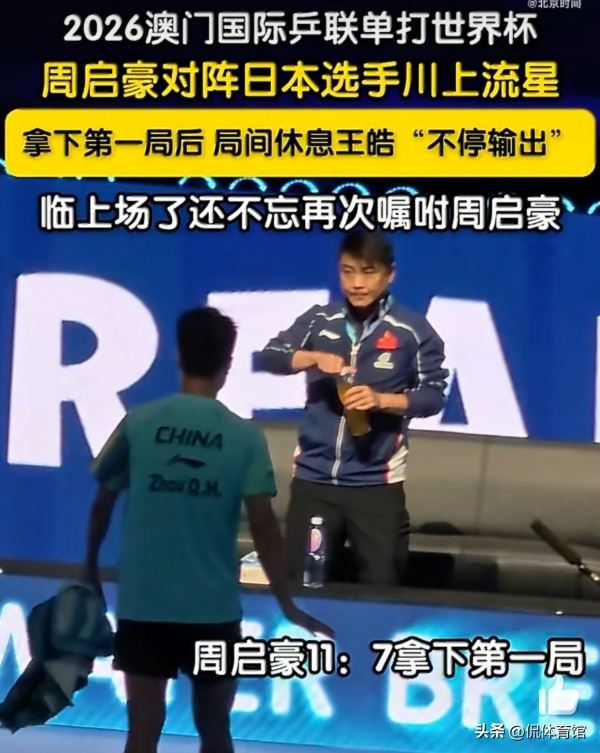 本场比赛主教练王皓全程坐镇场外,在局间休息及暂停期间对周启豪的发球变化、落点控制及心态调整进行了细致指导,对其取胜起到关键作用。
