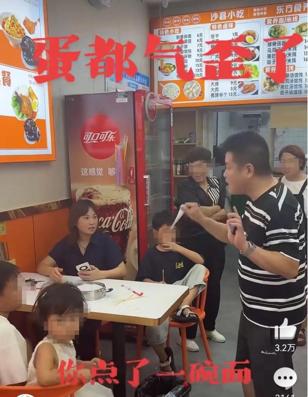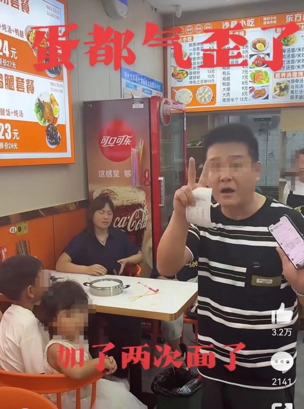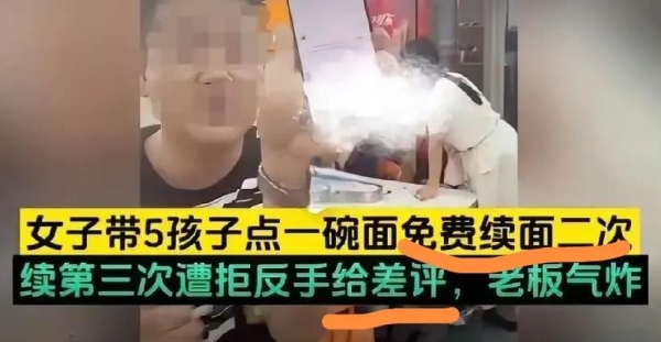 两名女子带了5个孩子来到餐厅就餐,但这么多人却只点了一碗面,也就是说一碗面7个人吃,老板看到这么多小孩可怜,前面已经免费给他们加了2次面了,但该女子居然要求免费加第三次面,老板果断拒绝了,结果该女子反手就给餐厅一个差评。