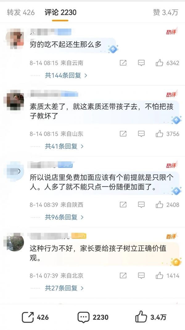 这种人利用免费续面,给多个小孩吃的行为,就是想薅羊毛。
