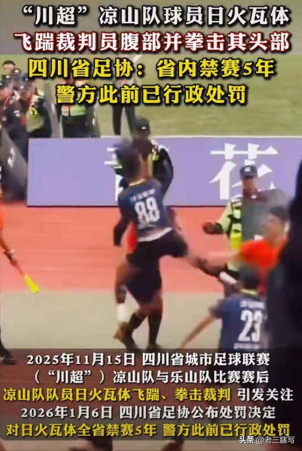 此前在川超联赛中暴力飞踹、殴打裁判的球员日火瓦体
