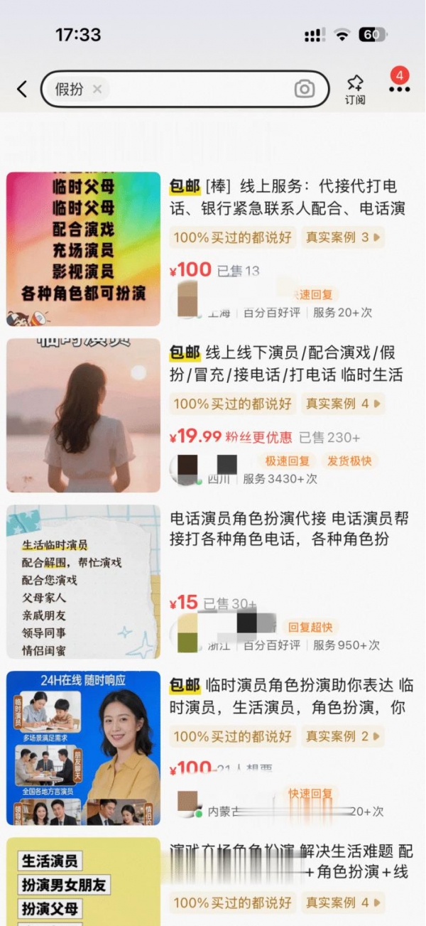 这事听着新鲜,其实早有苗头。二手交易平台成了"生活演员"的集散地。你想找男/女朋友?没问题。商家自称"实体公司",支持对公账户收款,还能全国接单。挑照片、定行程、谈价格,一套流程走下来,跟订酒店似的。