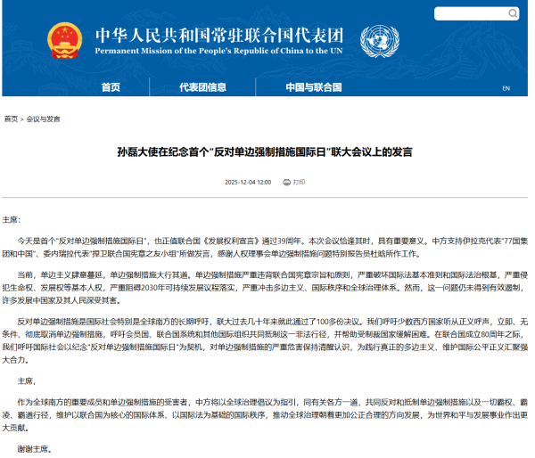 据中国常驻联合国代表团网站消息,当地时间12月4日, 联合国大会举行首个纪念"反对单边强制措施国际日"会议。中国常驻联合国副代表孙磊在会上发言,呼吁少数西方国家立即、无条件、彻底取消单边强制措施。