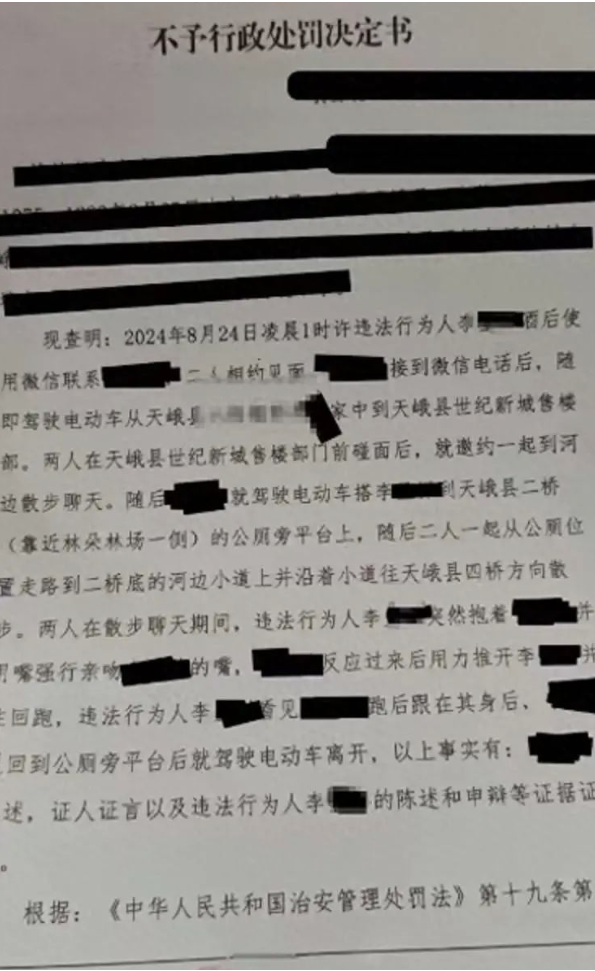 该网友发布了一份天峨县公安局的不予行政处罚决定书,上面载明,现查明2024年8月24日凌晨1时许违法行为人李某某酒后使用微信联系某某,二人相约见面。某某接到微信电话后,随即驾驶电动车从家中到天峨县世纪新城售楼部门前碰面后,就邀约一起到河边散步聊天……二人一起从公厕位置走路到二桥底的河边小道上,并沿着小道往天峨县四桥方向散步。两人在散步聊天期间,违法行为人李某某突然抱着某某,并用嘴强行亲吻某某的嘴,某某反应过来后用力推开李某某并往回跑,违法行为人李某某看见某某跑后跟在其身后,某某回到公厕旁平台后就驾驶电动车离开。