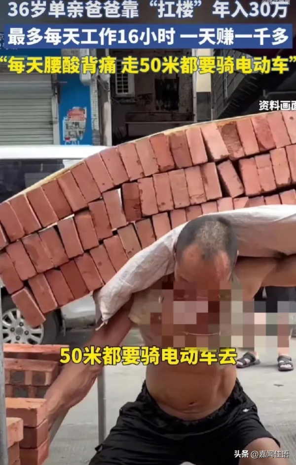 广东广州有一36岁的单亲爸爸,靠着搬砖扛楼能够年入30万,背后的艰辛看了让人心疼!镜头下,这个裸着上身的男人,弯下腰去熟练的扛起七八十块方砖,这些砖块在脊背上整整齐齐被码成三排,然后用绳子固定好,小心翼翼地被男人扛上高楼。这些楼栋里大多都没有设置电梯,属于老旧建筑,因此许多重物都是需要人工搬运。