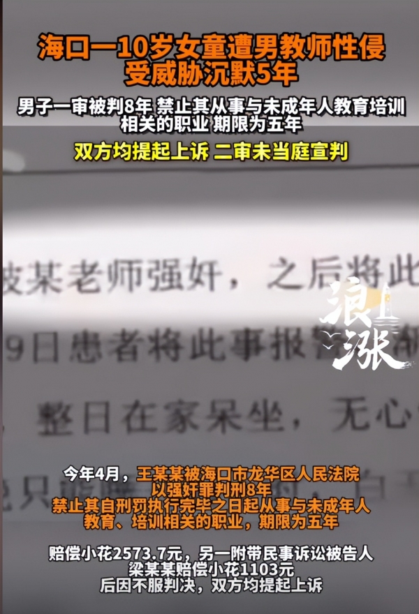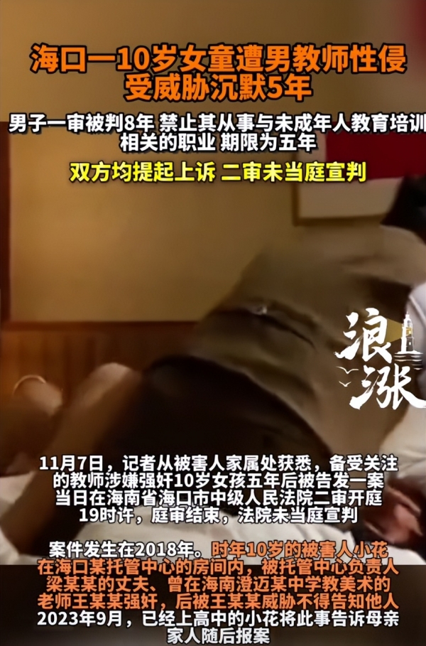 2025年11月7日,海口市中级人民法院审理了这起案件。被告王某某涉嫌在2018年强奸年仅10岁的女孩小花(化名),时隔五年才被揭发。二审当天,审理持续至晚间,但法院没有当庭宣判。