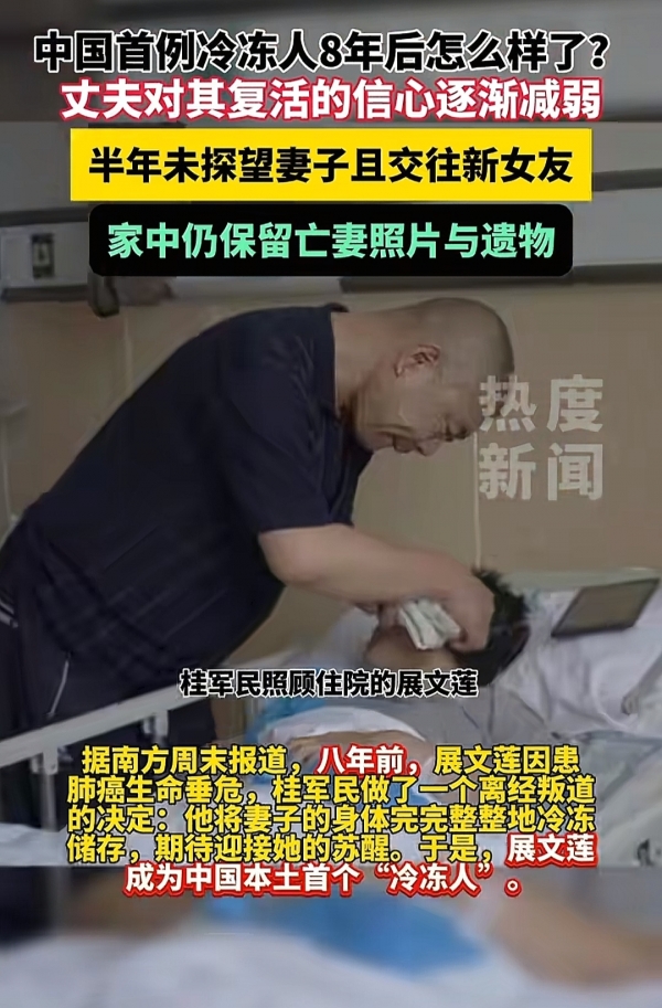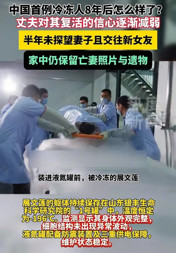 2017年5月,49岁的展文莲因肺癌晚期离世,丈夫桂军民做出了一个轰动全国的决定--将她的身体冷冻保存,盼着未来医学突破能让妻子"复活"。如今8年过去,展文莲作为中国首例冷冻人,仍在山东济南银丰研究院的"1号液氮罐"中沉睡,零下196℃的极寒环境由工作人员每10-15天补充液氮维持,冷冻协议一签就是30年。这8年里,桂军民经历了两次手术,健康大不如前,身边多了新伴侣王春霞,但他没忘旧妻,每年都会去探望,播放她爱听的邓丽君歌曲,自己也签了冷冻协议,想死后陪妻子"共赴未来"。