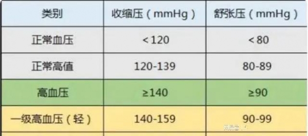 第一类:正常血压<130/85mmHg;第二类:正常高值血压130~139/85~89mmHg;第三类:1级高血压140~159/90~99mmHg;第四类:2级高血压≥160/100mmHg。
