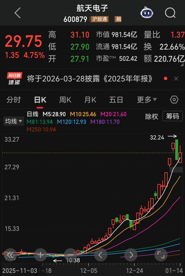 再看航天科技,这只股的走势简直是"刺激天花板"。1月14日早盘大幅低开,本以为要延续调整,结果盘中突然发力冲高,差点翻红,可下午又被资金砸到接近9%的跌幅,好在尾盘有资金抄底拉起一点,全天走出"V型反转再回落"的诡异走势,多空博弈激烈到极点。近期走势上,航天科技虽然没航天电子的连板数多,但波动极大,经常上演深V反转,累计涨幅也相当可观,属于"妖性十足"的代表。