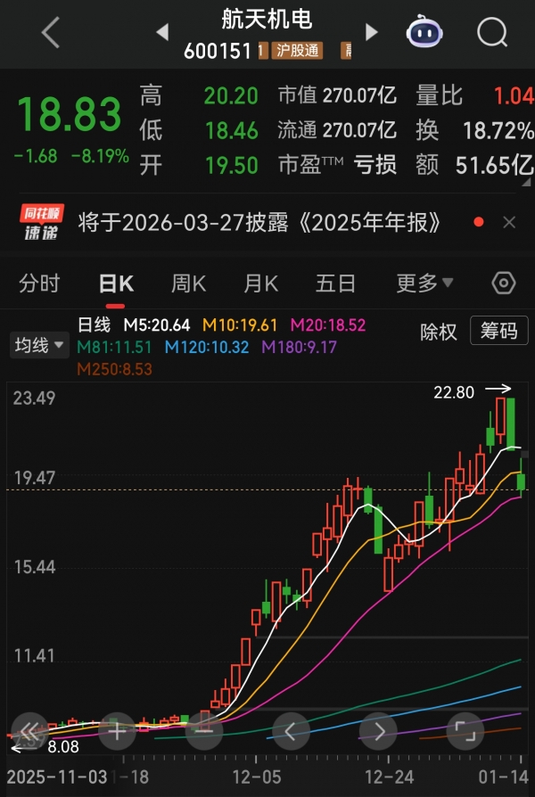 接着说航天机电,这只"稳健黑马"1月14日也没能扛住调整。当天开盘价19.50元,盘中最低跌到18.46元,一度接近跌停,好在尾盘有资金介入拉起,最终跌幅收窄到8.19%,全天成交额51.65亿元,换手率18.72%,筹码交换相当活跃。近期走势上,航天机电和航天电子类似,从2025年11月底启动后累计涨幅超100%,走的是"一步一个台阶"的稳健路线,背靠航天科技集团八院,还叠加了新能源业务,属于"航天+光伏"两条腿走路。