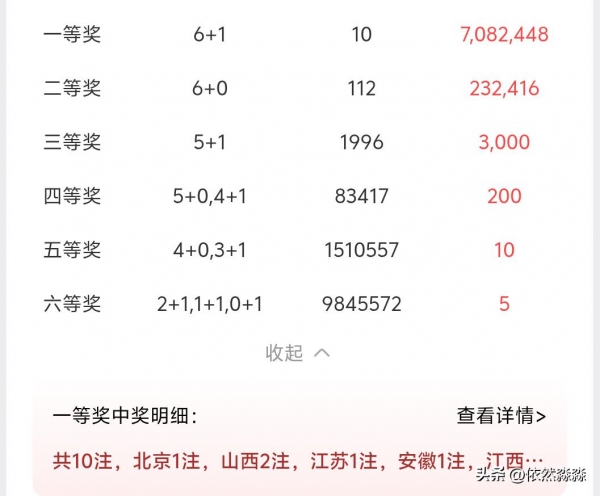 本期一等奖中出10注,每注奖金708万,二等奖112注,每注奖金23.2万,奖池累计26.9亿。