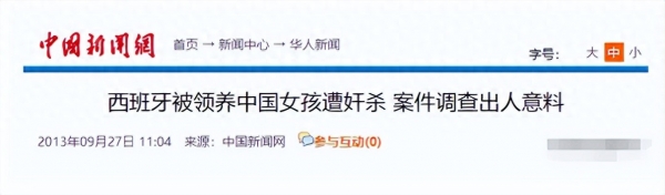 2013年,西班牙一对夫妇虐待并最终杀害了他们收养的12岁中国女孩,他们给女孩注射过量镇静剂,然后用毛巾捂住她的口鼻致其窒息而亡,这对夫妇最终被判处18年监禁。