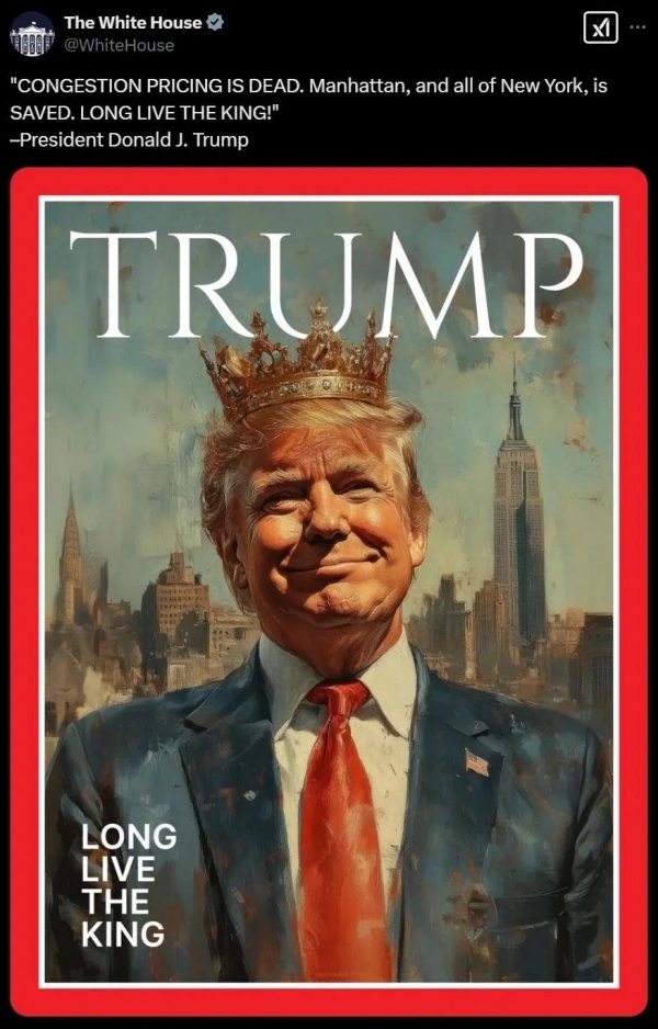 而重新上台的特朗普,则成为"帝王总统制"的集大成者。那张由他亲自转发的、实际并不存在的《时代》周刊国王封面,正是显著标志。