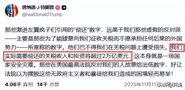 综合多家媒体报道,当地时间11月11日,特朗普在社交媒体上发文,矛头直指美国最高法院,称如果他的关税政策被裁定取消,美国将承担至少3万亿美元的损失。