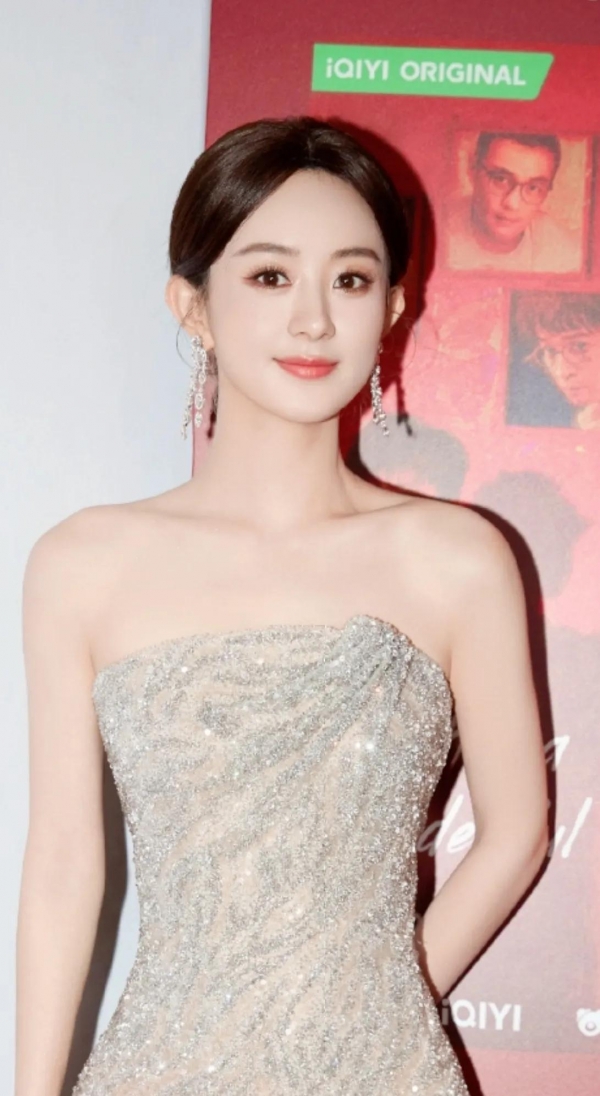 赵丽颖身穿阿玛尼最新鎏金战袍出场,抹胸的设计把她的直角肩和锁骨完美的展现出来。收腰的剪裁,让腰臀比例恰到好处。