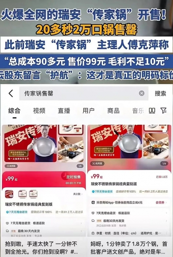 11月25日,在众多网友的催促下,浙江瑞安"传家锅"正式上线。然而,第一批预售的2万口锅,已有超10万人预约抢购,一经上线25秒便迅速售罄。