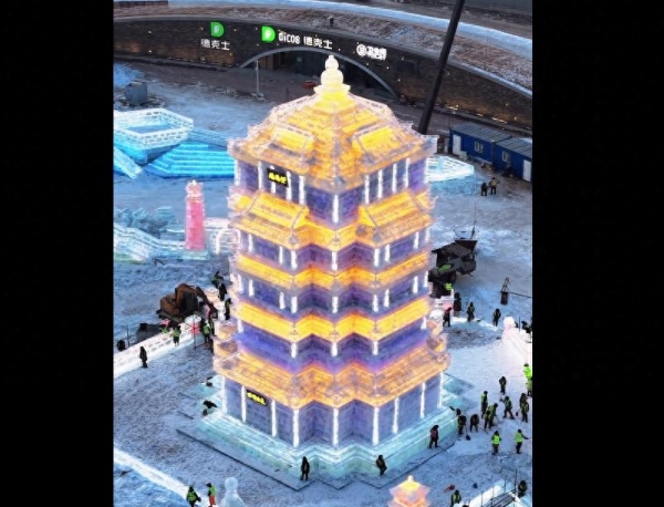 视频画面显示,该冰雕有五层楼高,基本还原了武汉黄鹤楼的造型,还具有金光闪闪的灯光。