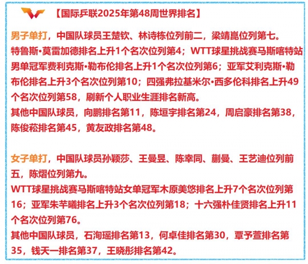 虽然未参加阿曼赛,王楚钦和孙颖莎的第48周世界排名榜首位置依然无可撼动。梁靖崑下滑1位目前第七,勒布伦兄弟均位列TOP10。