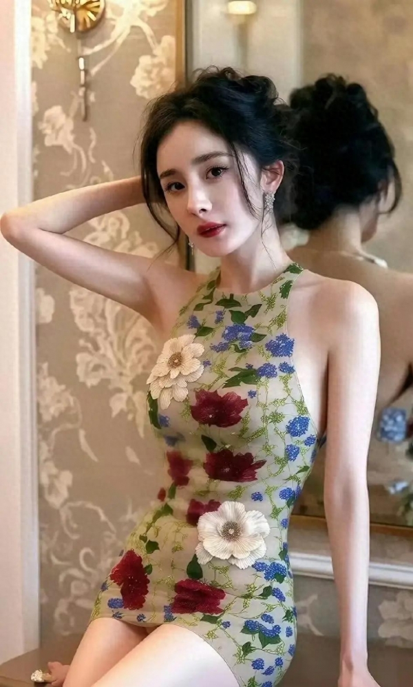 挂脖的设计,优雅地露出了她那标志性的天鹅颈和完美的肩线,没有一丝多余的赘肉。裙身之上,精致的彩色花卉图案层层叠叠,像是把一整个春天都穿在了身上。