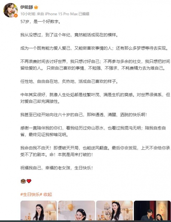 更让人动容的是,伊能静在生日当天发布的一篇长文,感恩自己的人生。她表示,随着年龄的增长,她变得更加从容、更加享受每个自己喜欢的瞬间,甚至坦言自己不再焦虑,反而在这个年龄段找到了内心的平静与幸福。伊能静所展现的"老女孩"心态,让她的粉丝和大众都深感钦佩,成为了许多人心中的人生典范。