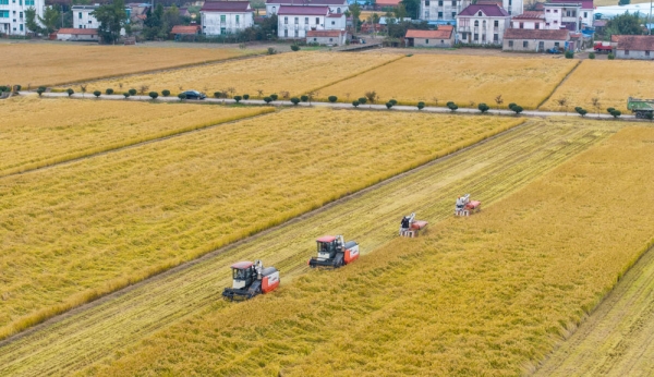 10月30日,在江苏省南通市通州区十总镇育民村高标准农田里,村民驾驶农机收割水稻(无人机照片)。 新华社发(翟慧勇摄)