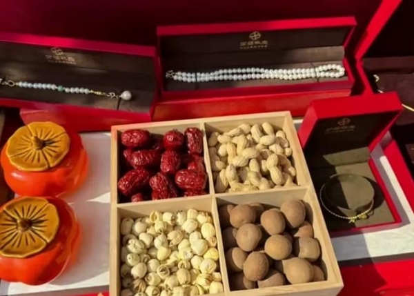 订婚现场布置得相当讲究,不仅有传统的黄金首饰作为礼物,桌上还摆放着象征着美好寓意的食物--花生、红枣、桂圆和莲子。这些食物的名字中各取一字,寓意着"早生贵子",莲子更进一步寓意"多子多福"。这样的布置让不少网友直呼"这订婚仪式比婚礼还隆重"。