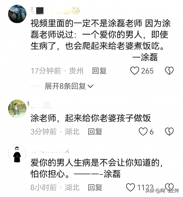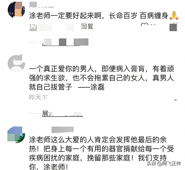 有人希望他别痊愈,别挺过来;还有人说:"一个爱你的男人,即使生病了,也要爬起来给老婆煮饭。"更有甚者讽刺道:"一个成熟顾家的男人,会把住院费拿来过日子,给老婆买七夕礼物,而不是在那躺着,消费家庭开支。"甚至更过分的,居然有人诅咒涂磊,还说已经帮他联系好器官捐献机构了。这些话简直太过分了,满满的都是对涂磊的恶意。