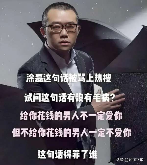 他说:"爱你的人,即便你是一朵难养的花,也能把你养得很好,不爱你的人,即便你是很好养的花,也会怪你不懂事。"另外,涂磊还说过:"男人喜欢游戏,女人喜欢浪漫,男人应该主动给女人花钱,女人不说不是她不想要,伸手去要是没有意义的,如果伸手还要不到,那将是更大的耻辱。"就因为这些话,涂磊的语录一个个都出圈了,也备受质疑,他遭受了好多的网暴和谩骂,好多人都吐槽他的发言。