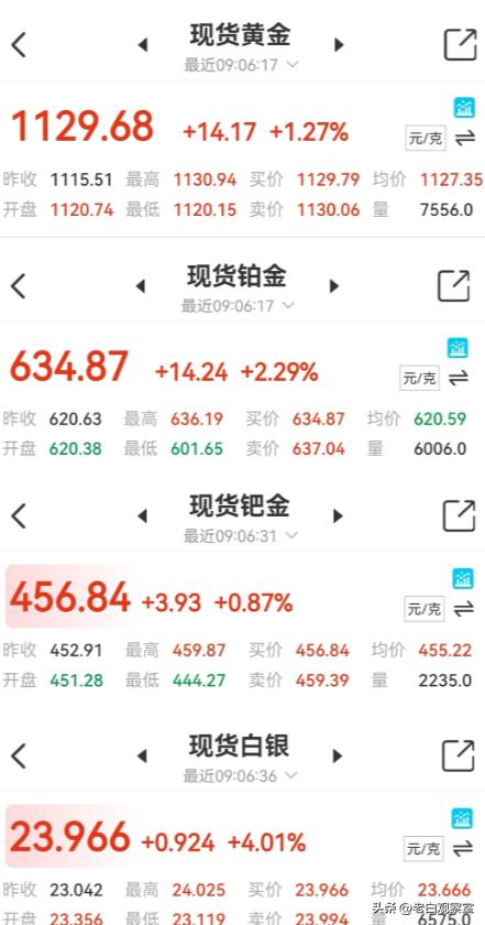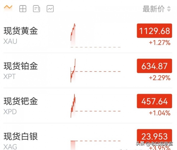 铂金和钯金也不甘落后,分别报 634.87 元 / 克、456.84 元 / 克,涨幅分别为 2.29%、0.87%,整个贵金属市场一片向好。
