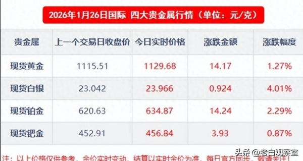 1 月 26 日早上的实时数据更是印证了这波上涨动能。黄金价格来到1129.68 元 / 克,涨幅 1.27%;白银直接暴涨 4.01%,以 23.966 元 / 克的价格领涨全场。