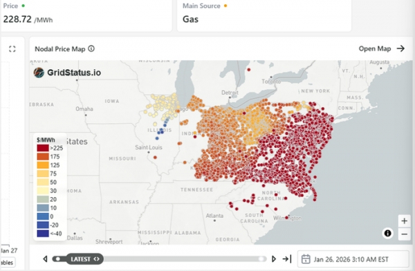 截至周一,全美还有81万户家庭处于停电状态,在严寒中煎熬。PJM电网预计,当天电力生产中断规模达22.4吉瓦,占总供电容量的16%。停电主要集中在中大西洋服务区域。这场电价暴涨不是单纯的天气意外,而是能源供需不平衡与深层矛盾的集中爆发。据报道,本周极寒天气还在持续。美国东北部出现强降雪,中大西洋部分地区有冻雨。这些天气进一步加大了能源供应压力。