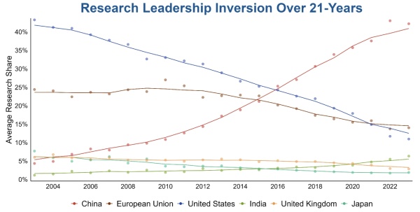 2003-2023年64项技术年均科研产出占比。21年后,全球科研领导力反转。ASPI在2024年发布的数据图表