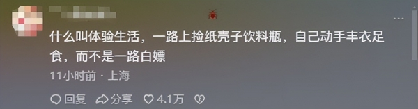 有网友表示:既然想体验生活,完全可以打零工找兼职挣钱,甚至可以捡废品去卖,而不是一路上只想着白嫖,消耗大家的善良。