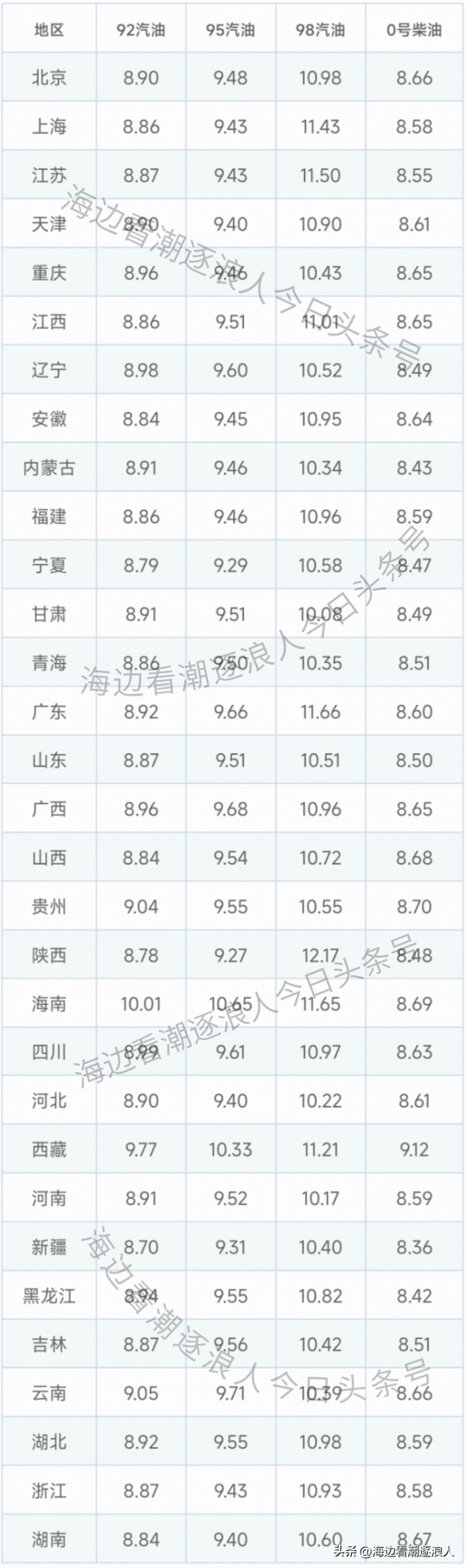 对于四川、西藏、内蒙古、贵州、黑龙江、云南、陕西、青海、新疆等省份的油价没有实行统一价格,这边列出的是省会城市的最高零售价格。