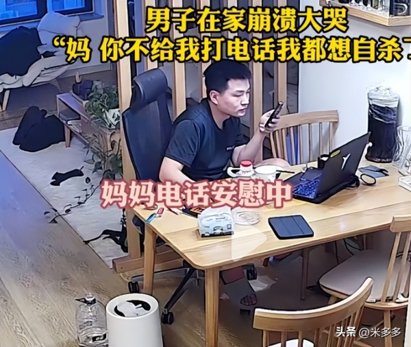 视频中,男子坐在电脑前,接到了妈妈的电话。