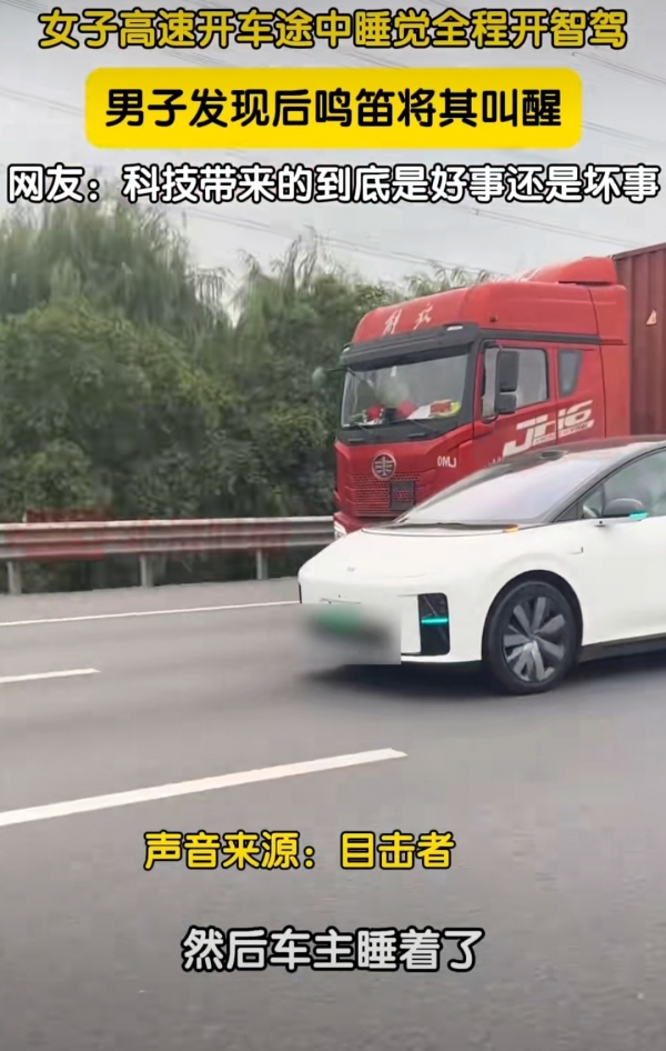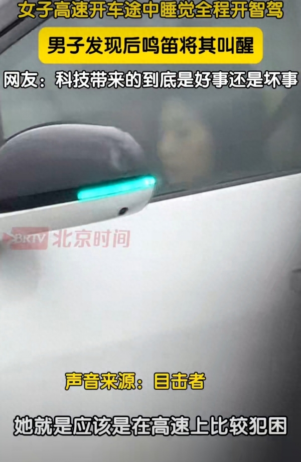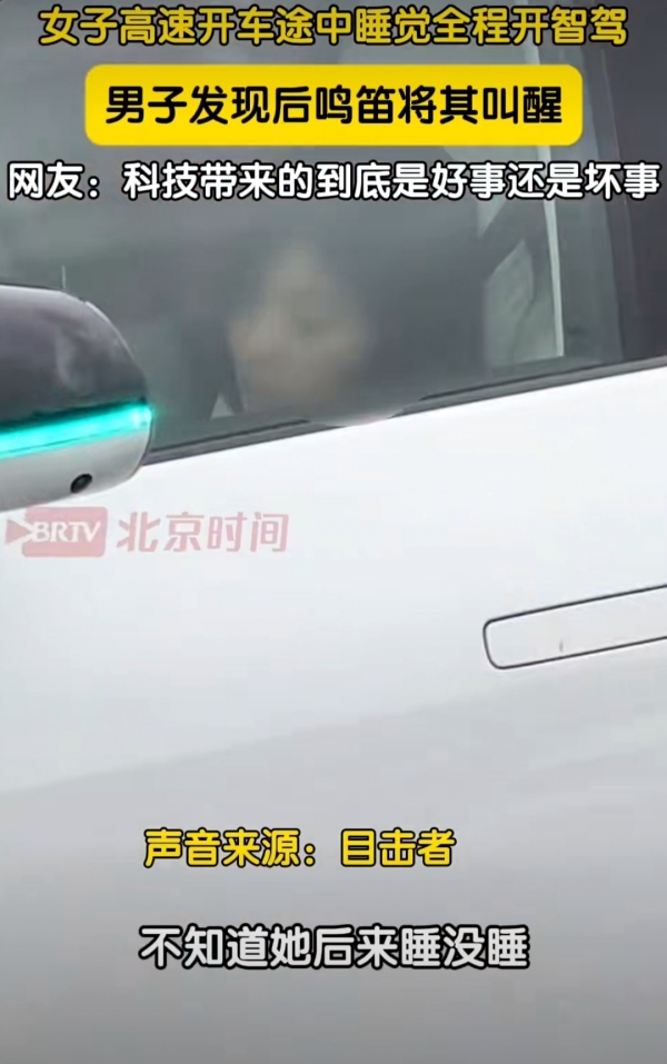 江苏苏州,陈先生开车在高速路上行驶,忽然看见前方一辆白色车辆行驶有问题。"我一看就知道肯定是开智驾了。"陈先生说。陈先生加速赶上该车,只见白车里一个女性司机正在睡觉。出于安全考虑,陈先生一直按喇叭想要叫醒这个女司机,在几分钟之后,终于叫醒,不知道陈先生超过她之后,有没有继续睡觉了。