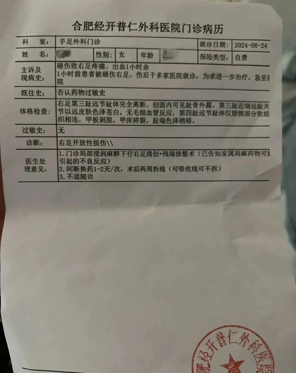拨打110和120电话后,救护车将孙先生妻子送往附近医院,医生表示,由于受伤的两根脚趾损坏严重,无法重新接上,最终孙先生和妻子选择残端修整,进行局部麻醉后,通过手术将被砸伤的部分切除,两根脚趾均只剩下半截左右。