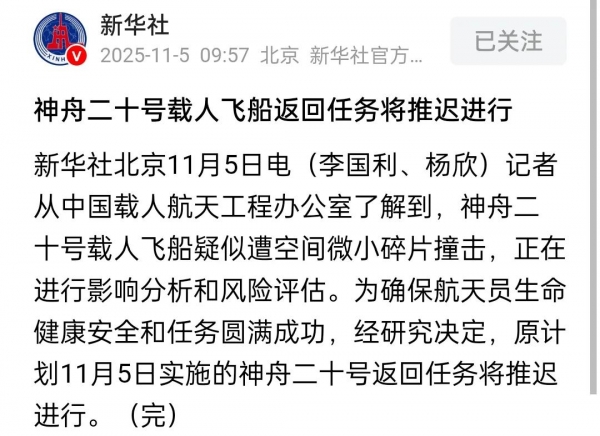 神舟二十一号飞船及其乘组已经于今年11月1日进驻我国空间站,按惯例,神舟二十号飞船及乘组将在一周内返回。然而一个突发状况突然出现--11月5日,中国载人航天工程办公室发布通报,原计划于当日执行的神舟二十号返回任务紧急推迟,核心原因是飞船疑似遭遇空间微小碎片之类的太空垃圾撞击,目前正开展全面的影响分析与风险评估,具体返回日期待定。央视新闻、新华网等媒体都已对此事件简短报道。