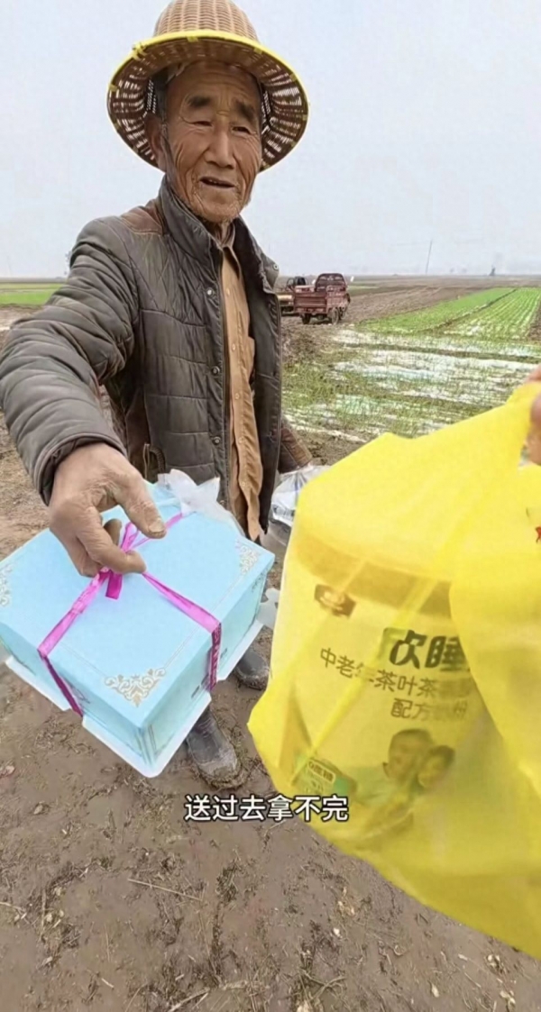 在她拍摄的视频里,六个核桃、烤鸭、烧鸡等像"惊喜盲盒"一样从后备厢里拿出,镜头一转,是老人们喜气盈盈的笑脸。