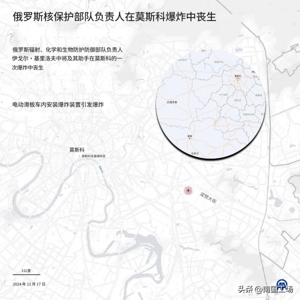 基里洛夫中将死于一场有预谋的暗杀,暗杀者在2024年12月16日晚将一辆安装有爆炸装置的电动滑板车,放到了基里洛夫住处莫斯科东南部梁赞大街的一栋居民楼的单元楼门口处。在2024年12月17日清晨6点,基里洛夫与助理出门时遥控引爆了炸弹,两人当场被炸身亡。