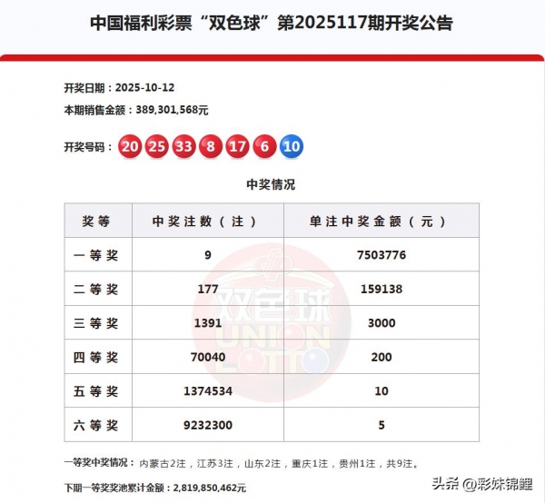 今天10月12日,星期日,晚上双色球25117期开奖出炉了。