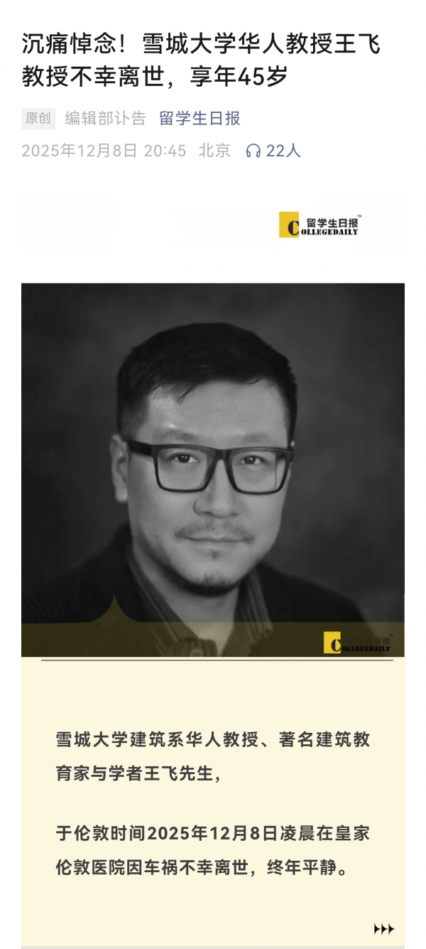 但在国内媒体报道之前,《留学生日报》编辑部就已经发布了悼念文章,称王飞教授是在伦敦遭遇了车祸,在皇家伦敦医院不幸去世。